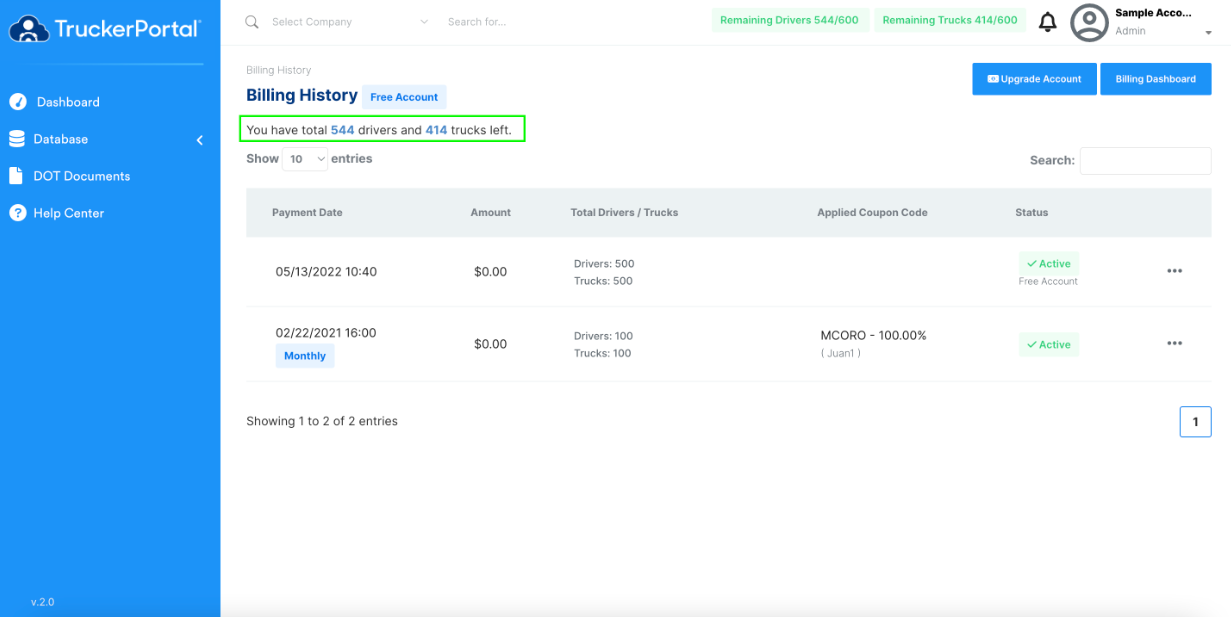 You can view your available Drivers and Trucks on the website header. The remaining number will represent how many Drivers and Trucks you have left in your account.